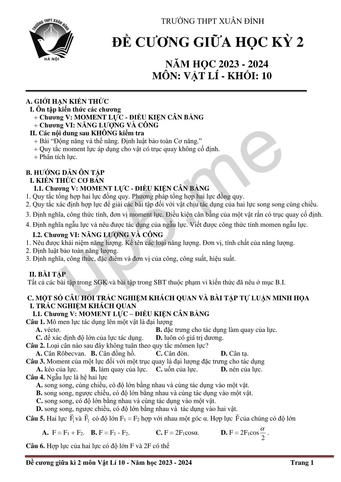 NĂM HỌC 2023 - 2024 MÔN: VẬT LÍ - KHỐI: 10