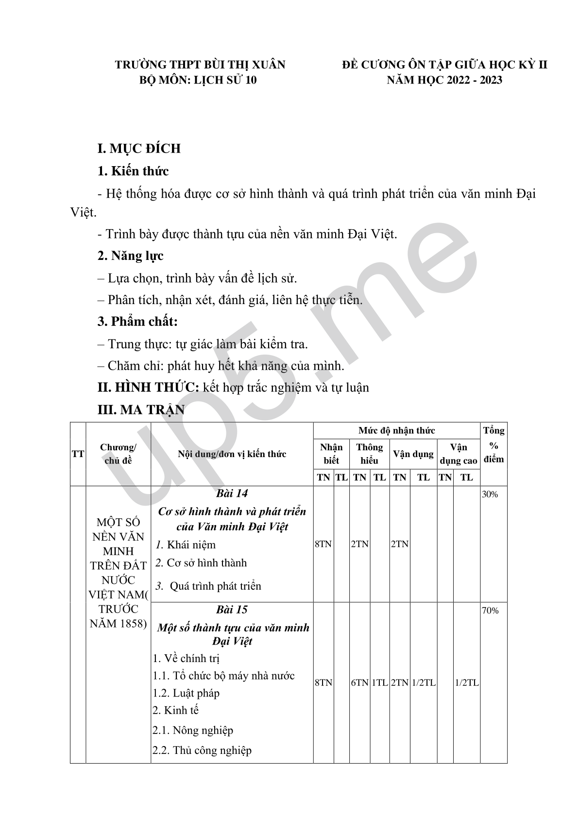 II. HÌNH THỨC: kết hợp trắc nghiệm và tự luận