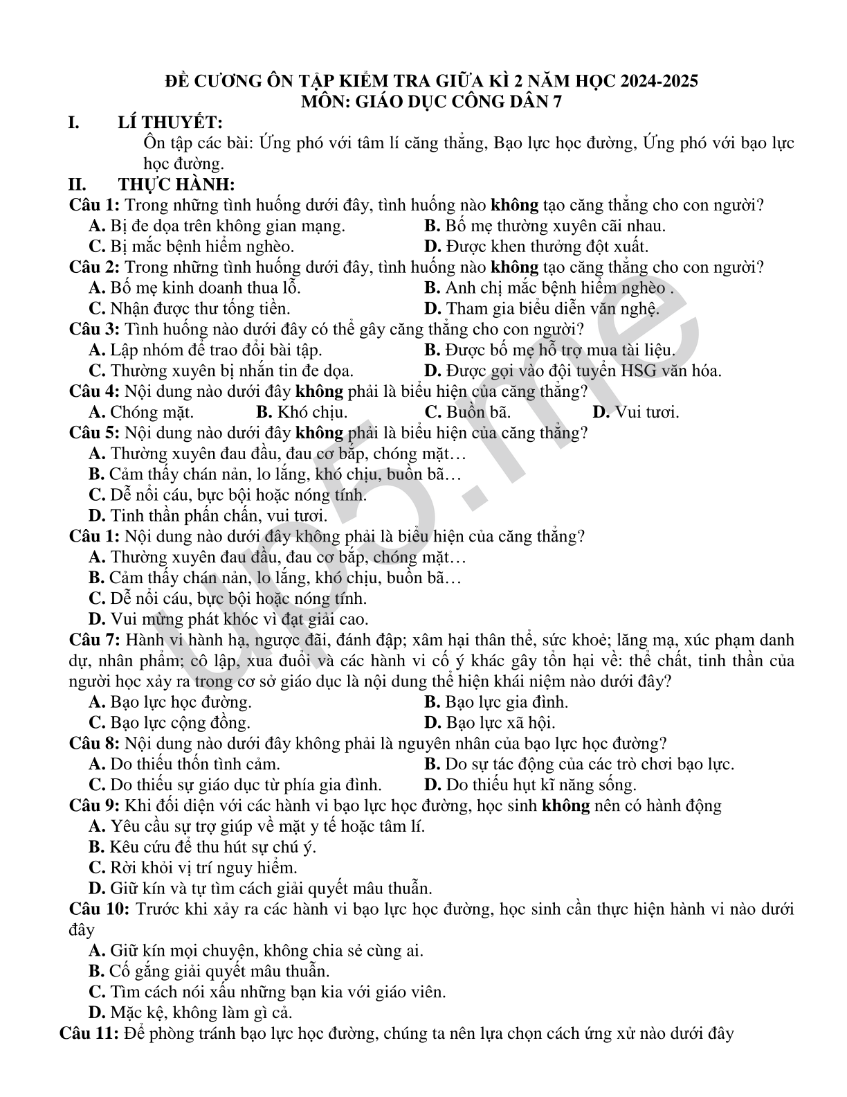 Ôn tập các bài: Ứng phó với tâm lí căng thẳng, Bạo lực học đường, Ứng phó với bạo lực học đường.