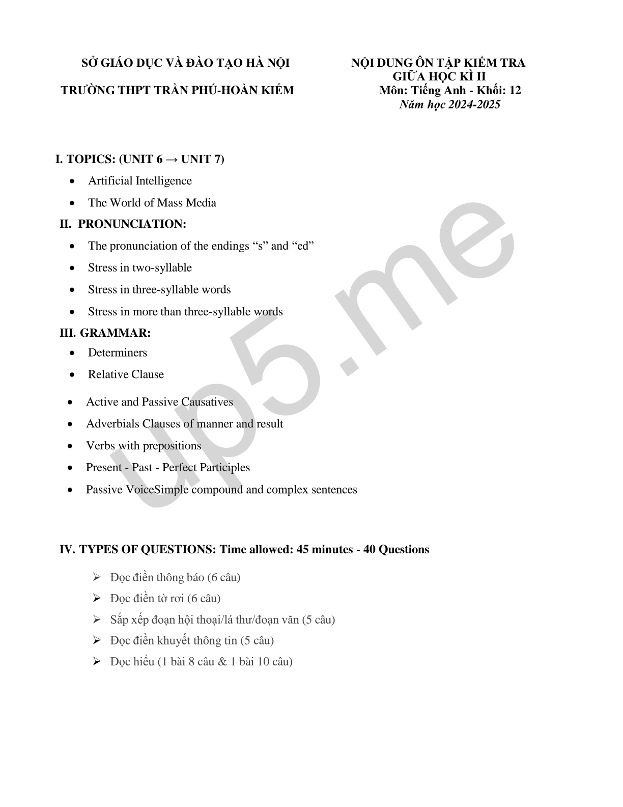 | TRƯỜNG THPT TRẦN PHÚ-HOÀN KIẾM | Môn: Tiếng Anh - Khối: 12 |