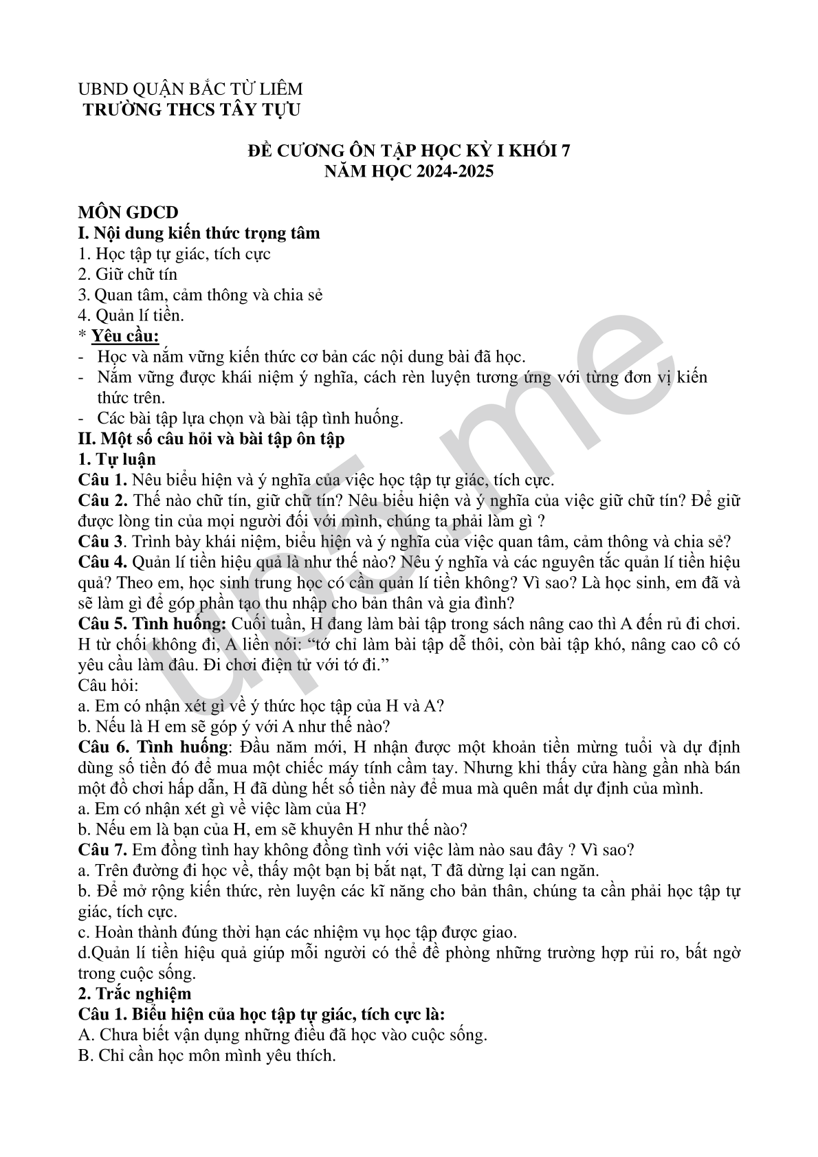 ĐỀ CƯƠNG ÔN TẬP HỌC KỲ I KHỐI 7