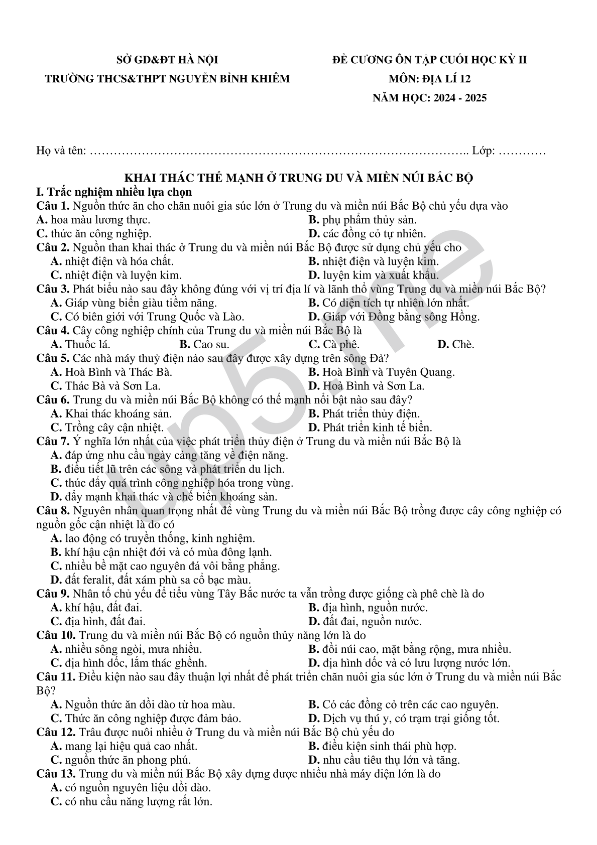 | SỞ GD&ĐT HÀ NỘITRƯỜNG THCS&THPT NGUYỄN BỈNH KHIÊM | ĐỀ CƯƠNG ÔN TẬP CUỐI HỌC KỲ II MÔN: ĐỊA LÍ 12NĂM HỌC: 2024 - 2025 |