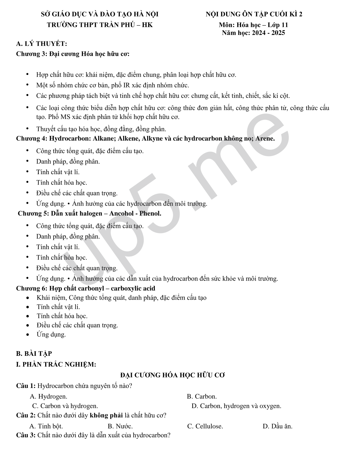 Câu 1: Hydrocarbon chứa nguyên tố nào?
