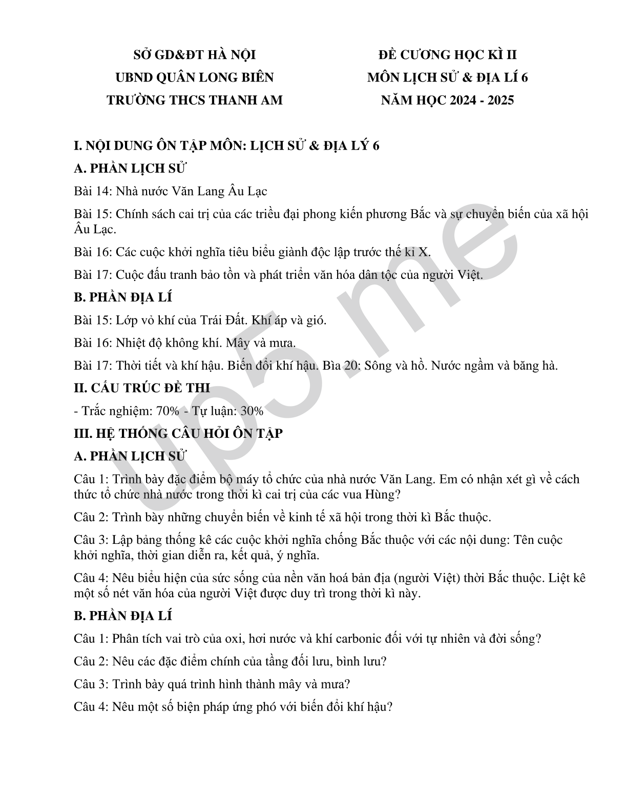 | SỞ GD&ĐT HÀ NỘIUBND QUÂN LONG BIÊNTRƯỜNG THCS THANH AM | ĐỀ CƯƠNG HỌC KÌ IIMÔN LỊCH SỬ & ĐỊA LÍ 6NĂM HỌC 2024 - 2025 |