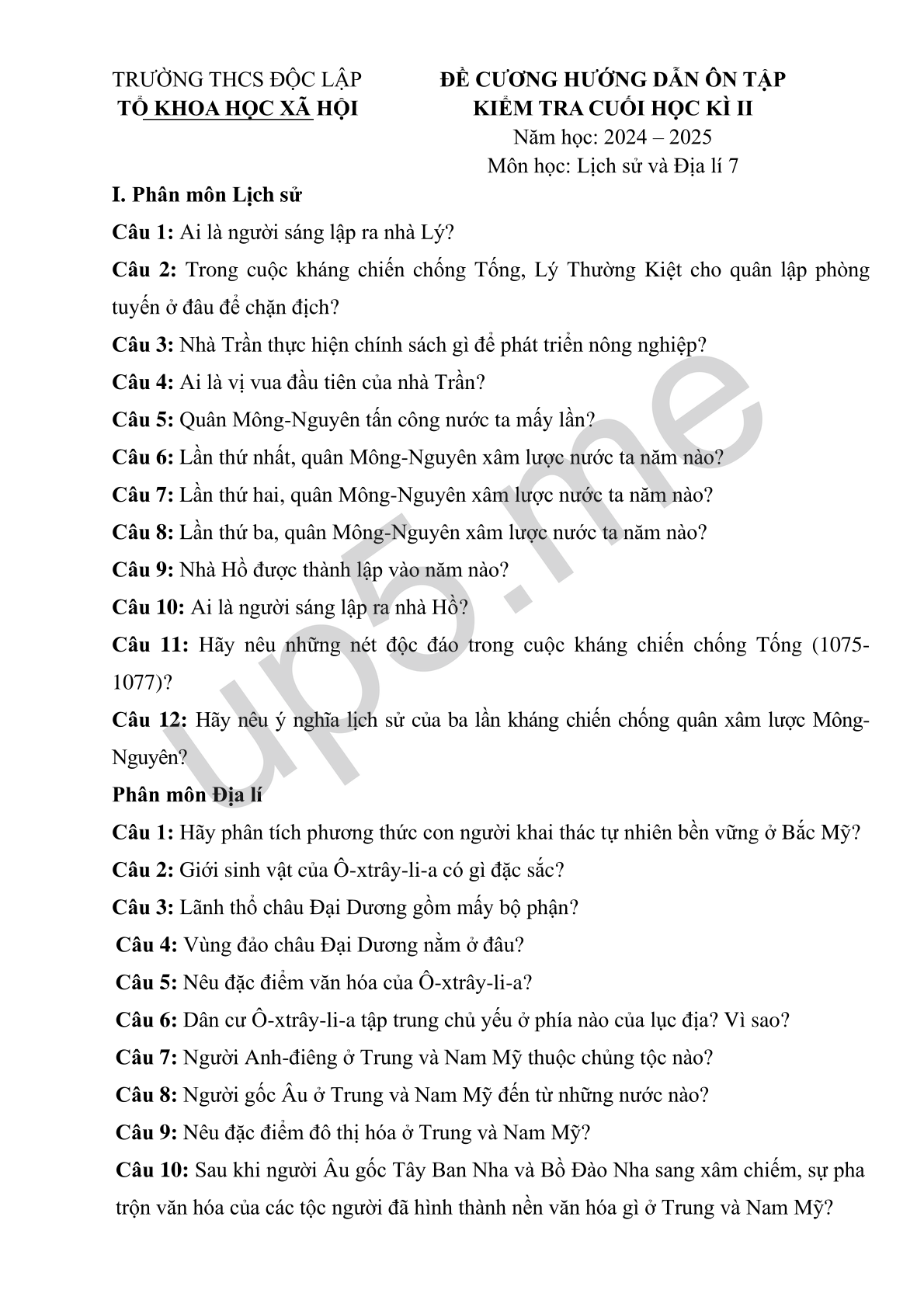 | TRƯỜNG THCS ĐỘC LẬP | ĐỀ CƯƠNG HƯỚNG DẪN ÔN TẬP |