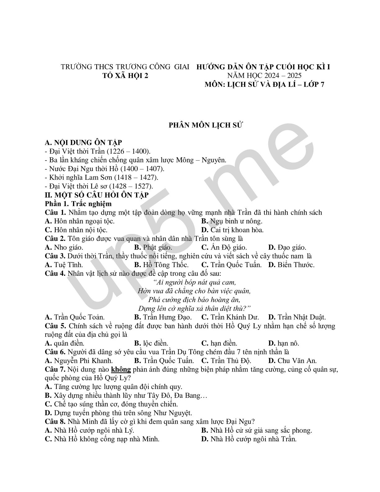 | TRƯỜNG THCS TRƯƠNG CÔNG GIAITỔ XÃ HỘI 2 | HƯỚNG DẪN ÔN TẬP CUỐI HỌC KÌ IINĂM HỌC 2024 – 2025MÔN: LỊCH SỬ VÀ ĐỊA LÍ – LỚP 7 |