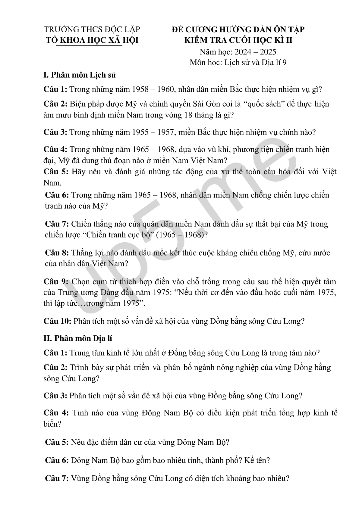 | TRƯỜNG THCS ĐỘC LẬP | ĐỀ CƯƠNG HƯỚNG DẪN ÔN TẬP |