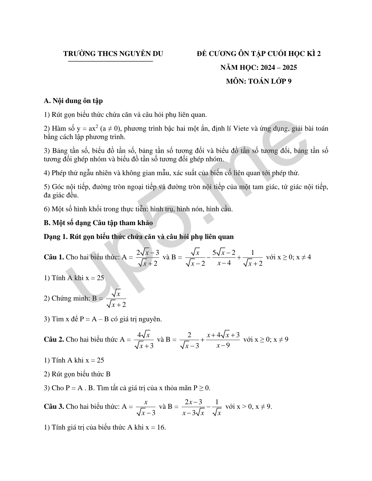 | TRƯỜNG THCS NGUYỄN DU | ĐỀ CƯƠNG ÔN TẬP CUỐI HỌC KÌ 2NĂM HỌC: 2024 – 2025MÔN: TOÁN LỚP 9 |