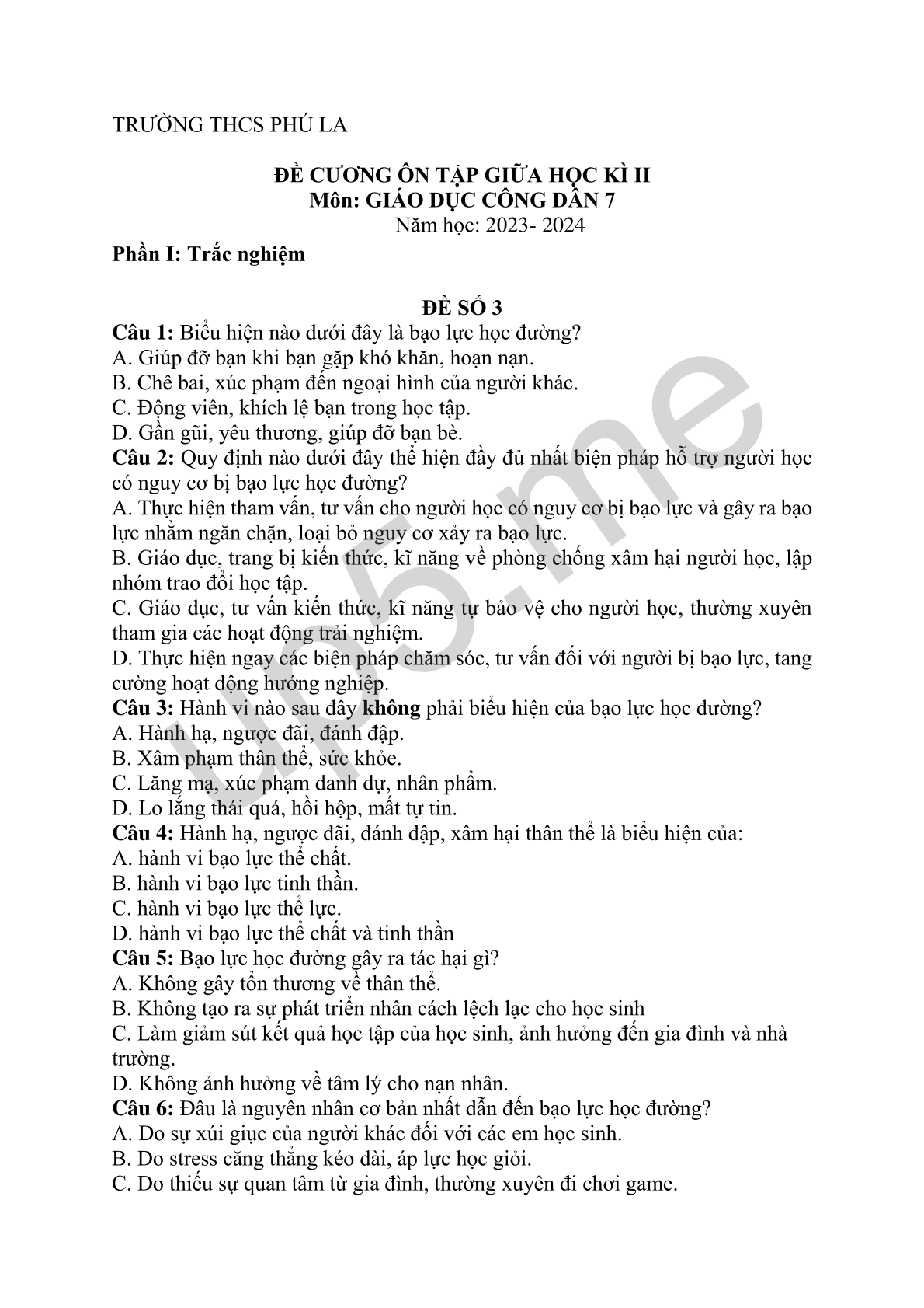 Câu 2: Quy định nào dưới đây thể hiện đầy đủ nhất biện pháp hỗ trợ người học có nguy cơ bị bạo lực học đường?
