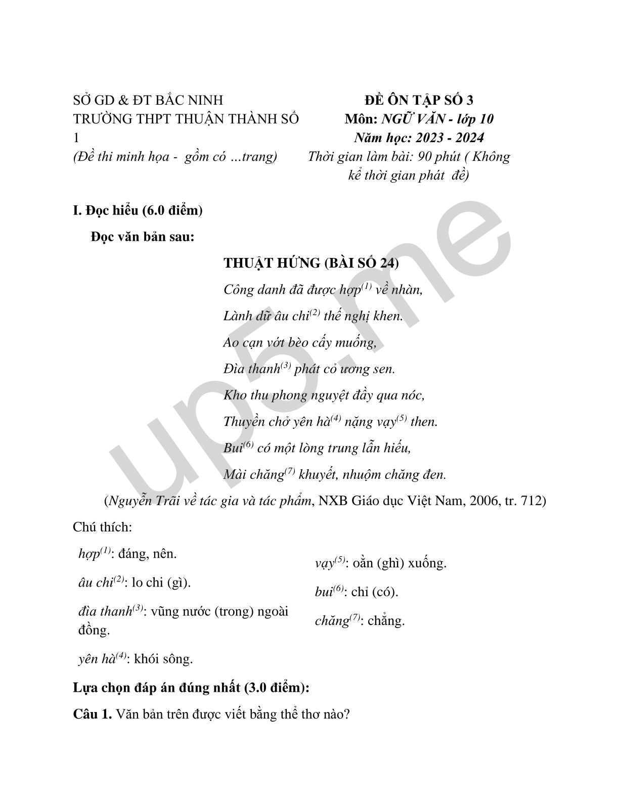 ĐỀ ÔN TẬP SỐ 3 Môn: NGỮ VĂN - lớp 10 Năm học: 2023 - 2024 Thời gian làm bài: 90 phút ( Không kể thời gian phát đề) |
