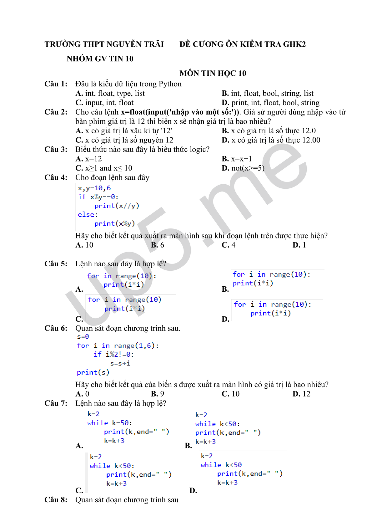 Câu 4: Cho đoạn lệnh sau đây