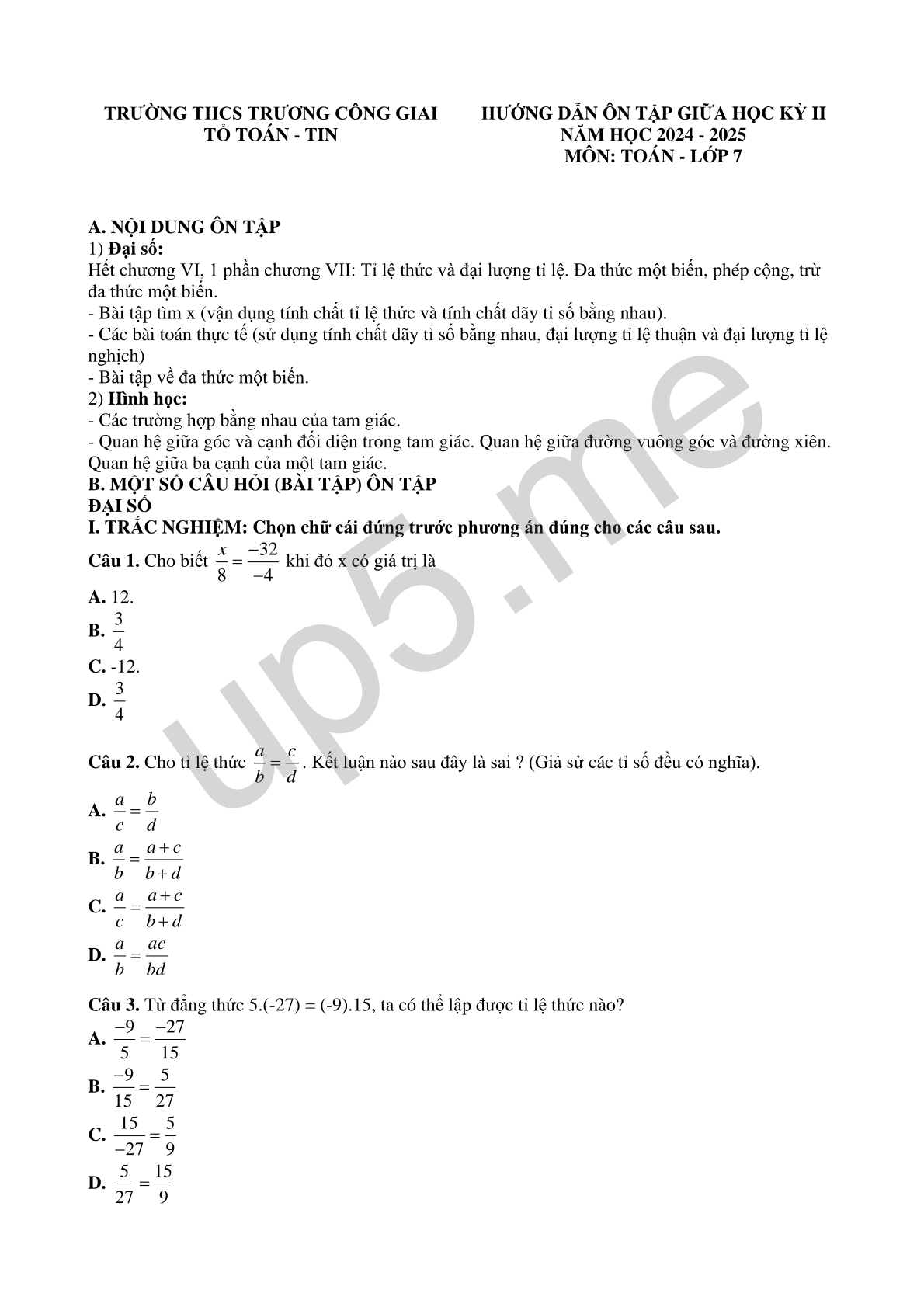 HƯỚNG DẪN ÔN TẬP GIỮA HỌC KỲ II NĂM HỌC 2024 - 2025 MÔN: TOÁN - LỚP 7 |