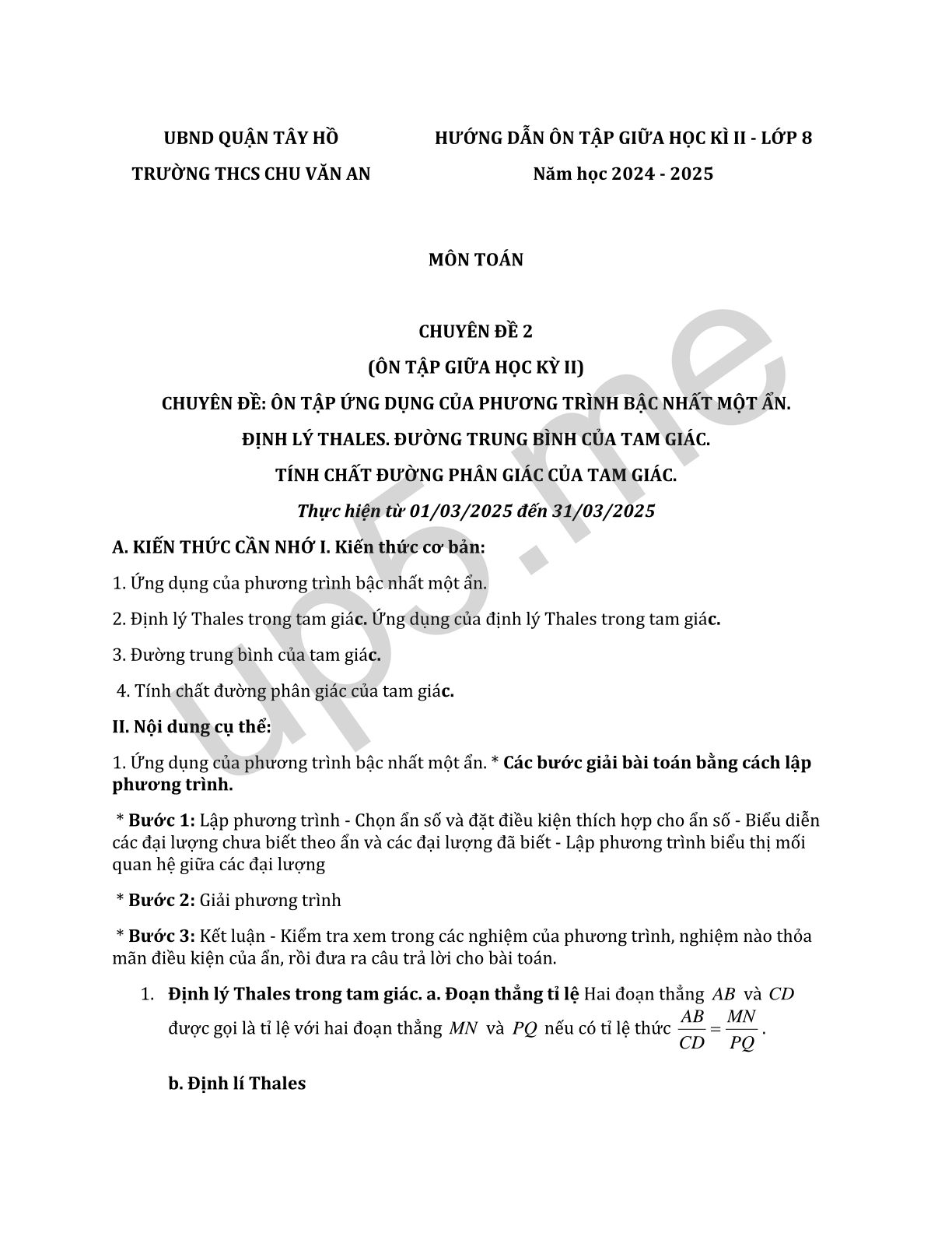 | UBND QUẬN TÂY HỒTRƯỜNG THCS CHU VĂN AN | HƯỚNG DẪN ÔN TẬP GIỮA HỌC KÌ II - LỚP 8Năm học 2024 - 2025 |
