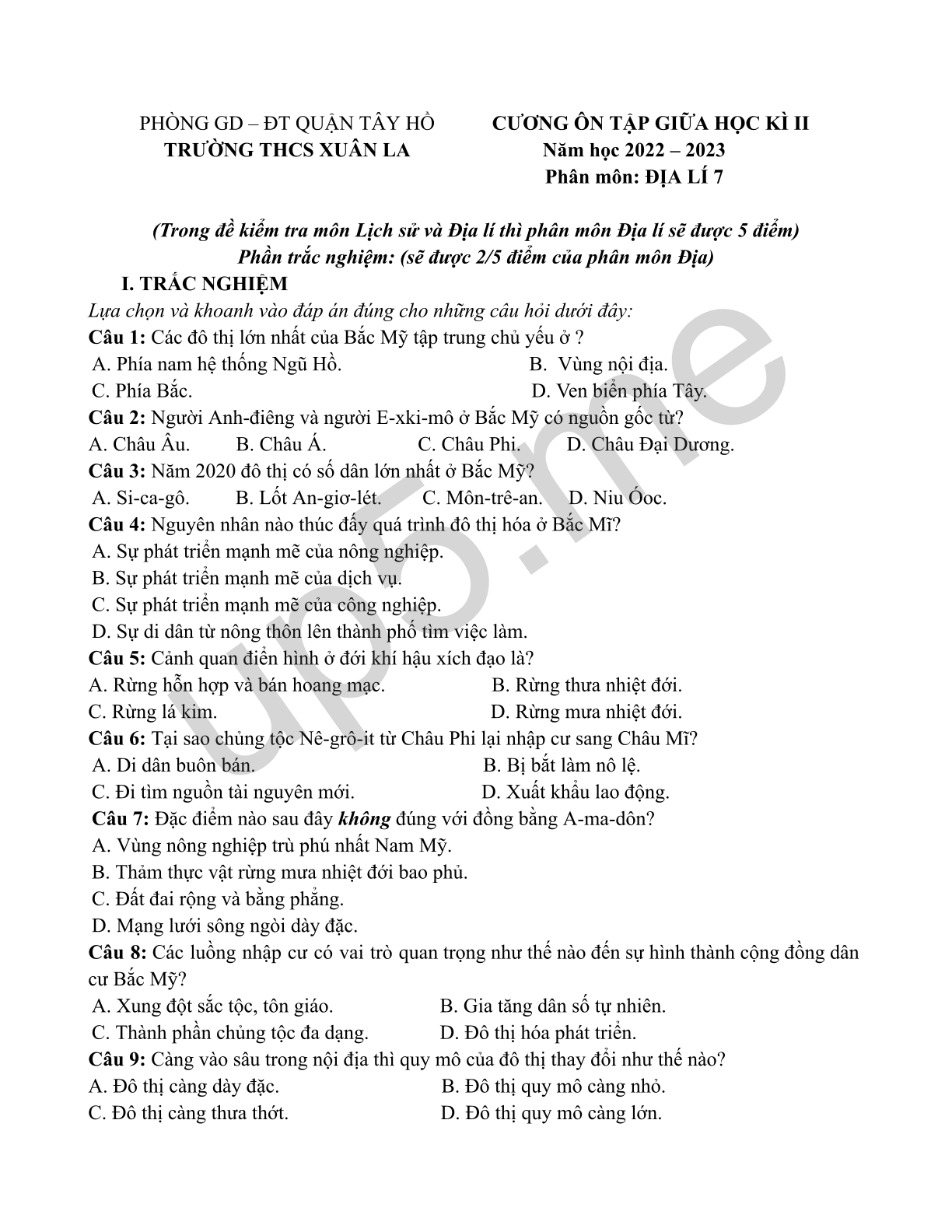 Phần trắc nghiệm: (sẽ được 2/5 điểm của phân môn Địa)