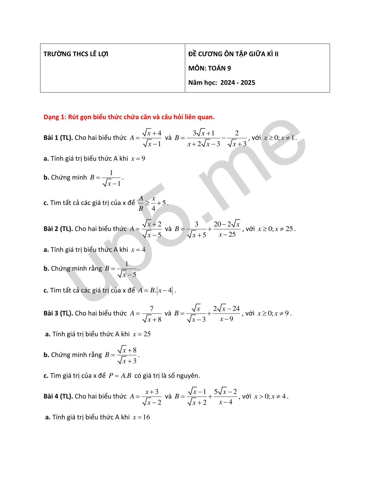 ĐỀ CƯƠNG ÔN TẬP GIỮA KÌ IIMÔN: TOÁN 9Năm học: 2024 - 2025 |