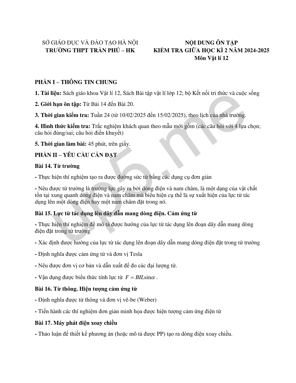 NỘI DUNG ÔN TẬP KIỂM TRA GIỮA HỌC KÌ 2 NĂM 2024-2025 Môn Vật lí 12 |
