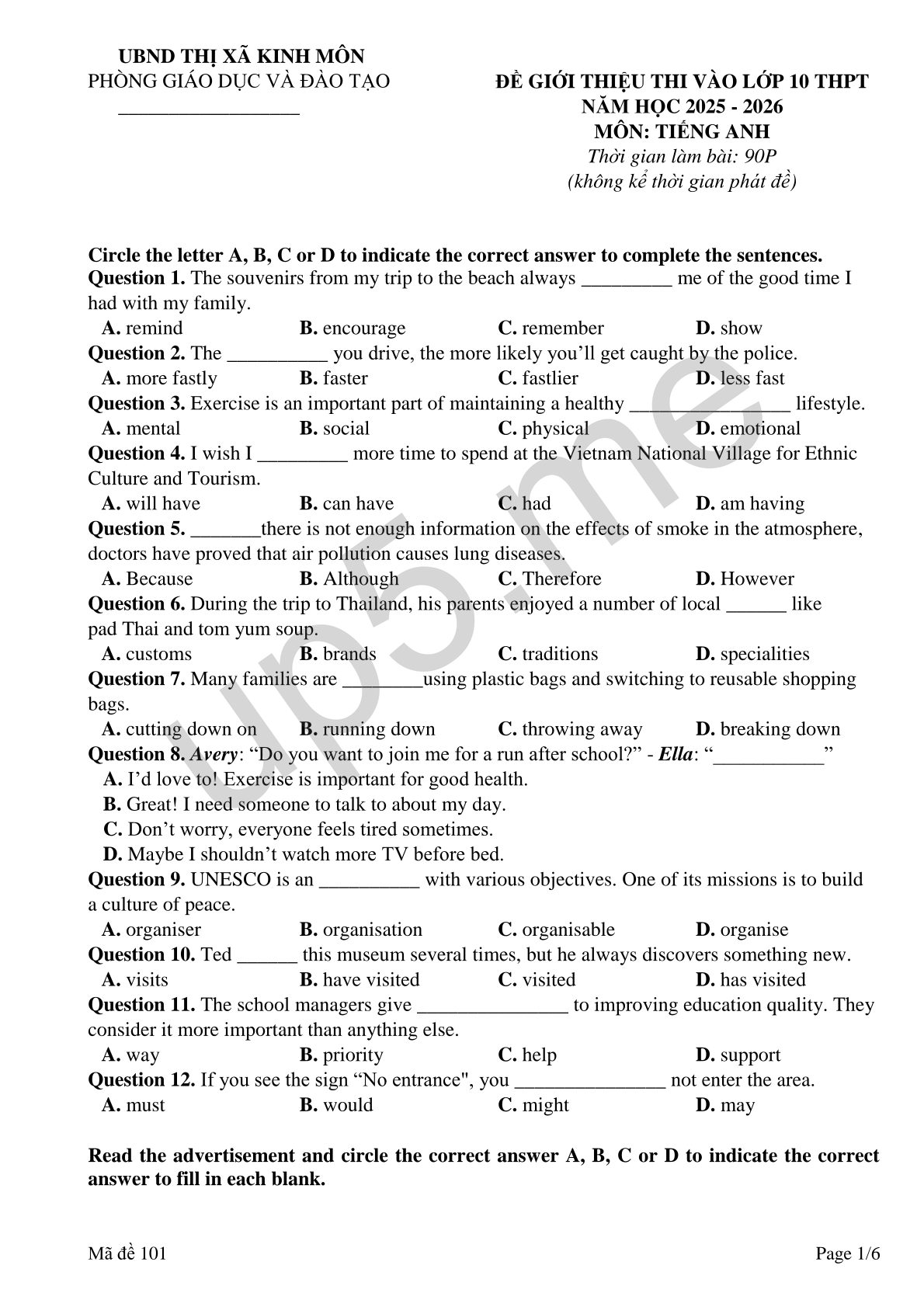 ĐỀ GIỚI THIỆU THI VÀO LỚP 10 THPT NĂM HỌC 2025 - 2026 MÔN: TIẾNG ANH Thời gian làm bài: 90P (không kể thời gian phát đề) |
