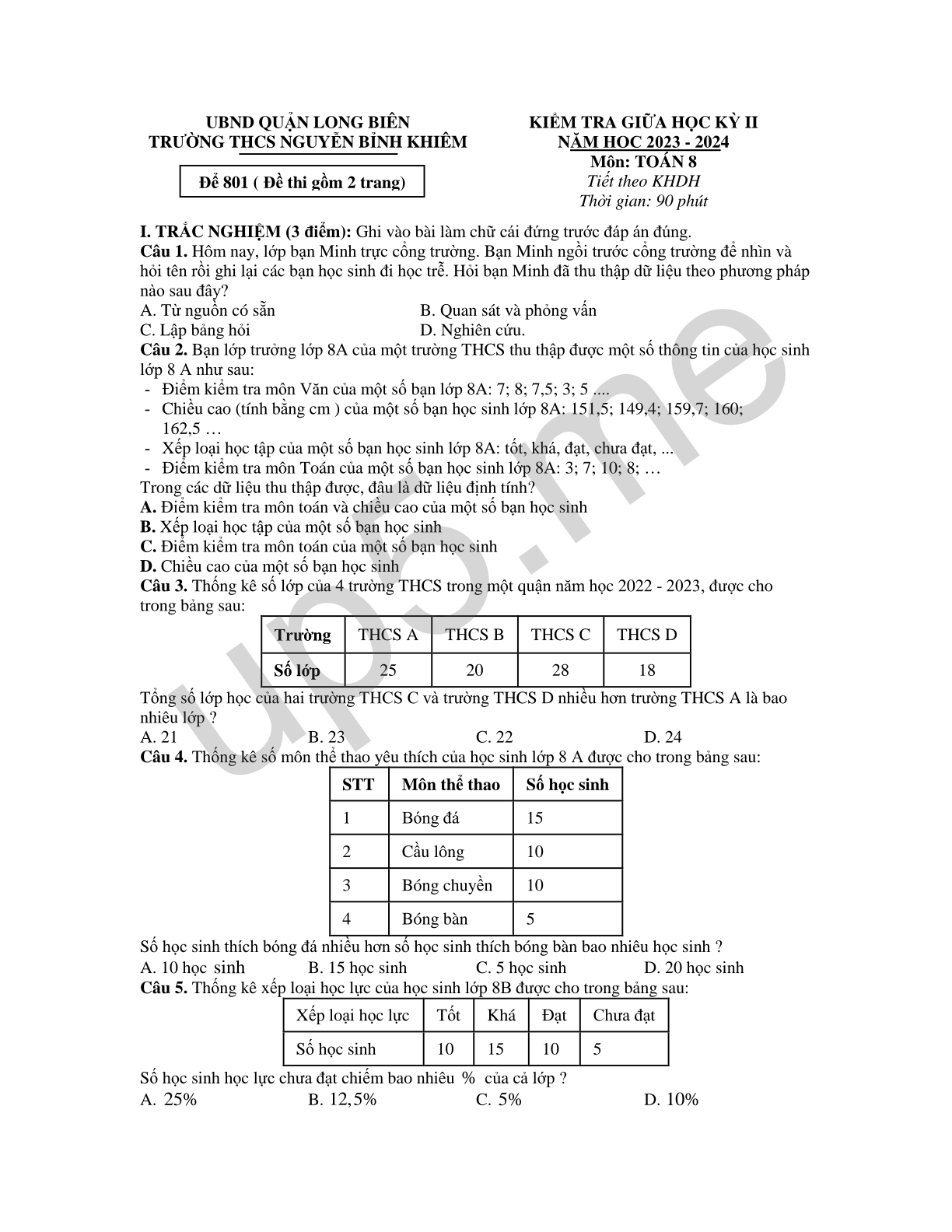 Câu 1. Hôm nay, lớp bạn Minh trực cổng trường. Bạn Minh ngồi trước cổng trường để nhìn và hỏi tên rồi ghi lại các bạn học sinh đi học trễ. Hỏi bạn Minh đã thu thập dữ liệu theo phương pháp nào sau đây?