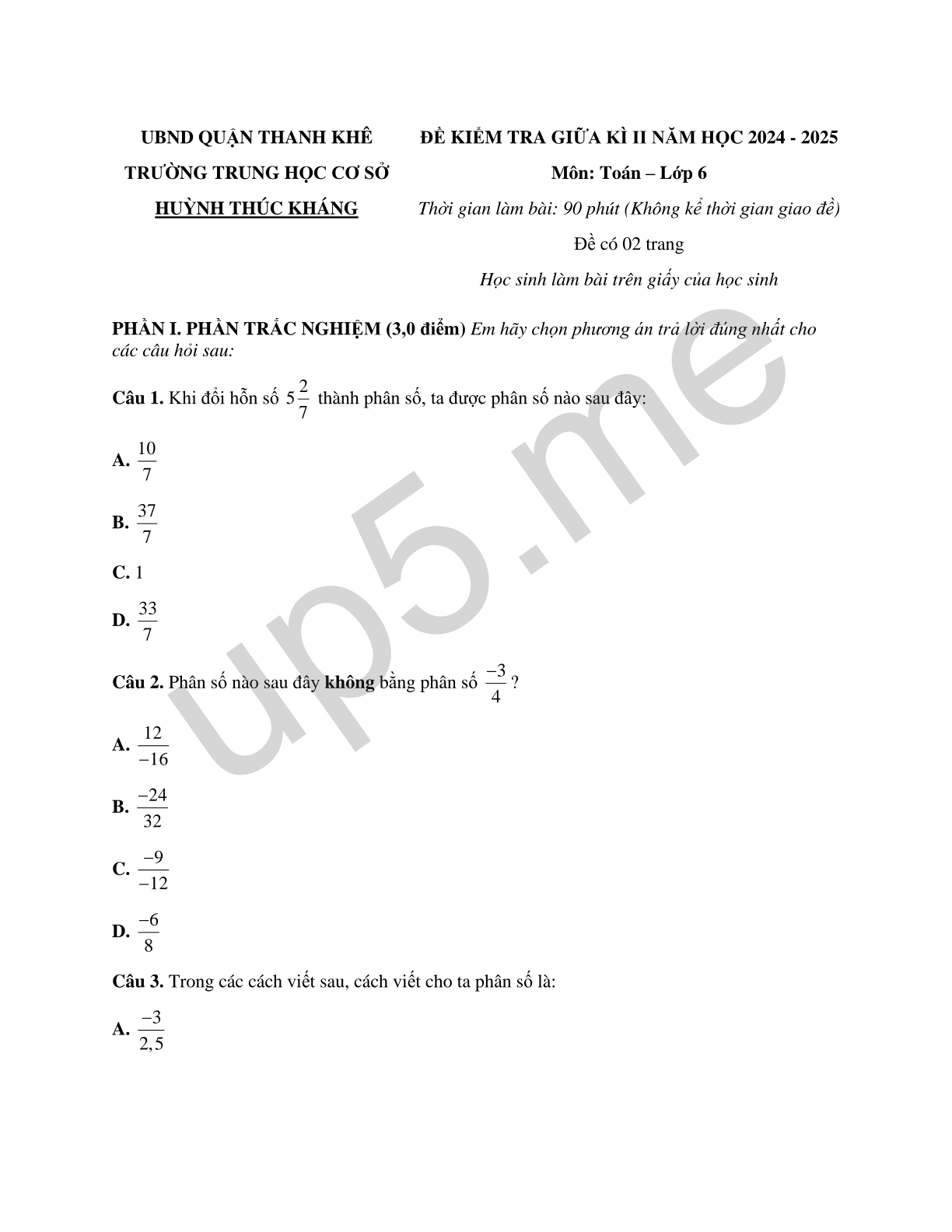 | UBND QUẬN THANH KHÊTRƯỜNG TRUNG HỌC CƠ SỞ HUỲNH THÚC KHÁNG | ĐỀ KIỂM TRA GIỮA KÌ II NĂM HỌC 2024 - 2025Môn: Toán – Lớp 6Thời gian làm bài: 90 phút (Không kể thời gian giao đề)Đề có 02 trangHọc sinh làm bài trên giấy của học sinh |