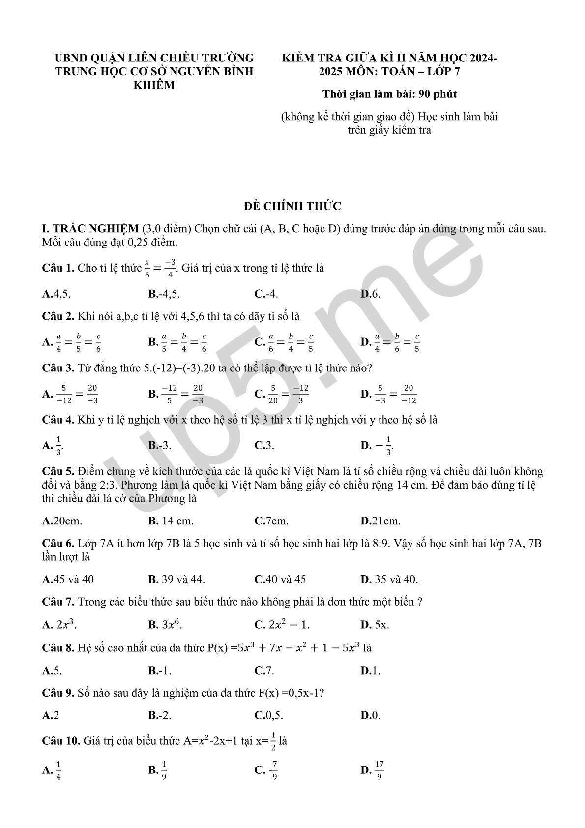 KIỂM TRA GIỮA KÌ II NĂM HỌC 2024-2025 MÔN: TOÁN – LỚP 7Thời gian làm bài: 90 phút (không kể thời gian giao đề) Học sinh làm bài trên giấy kiểm tra |
