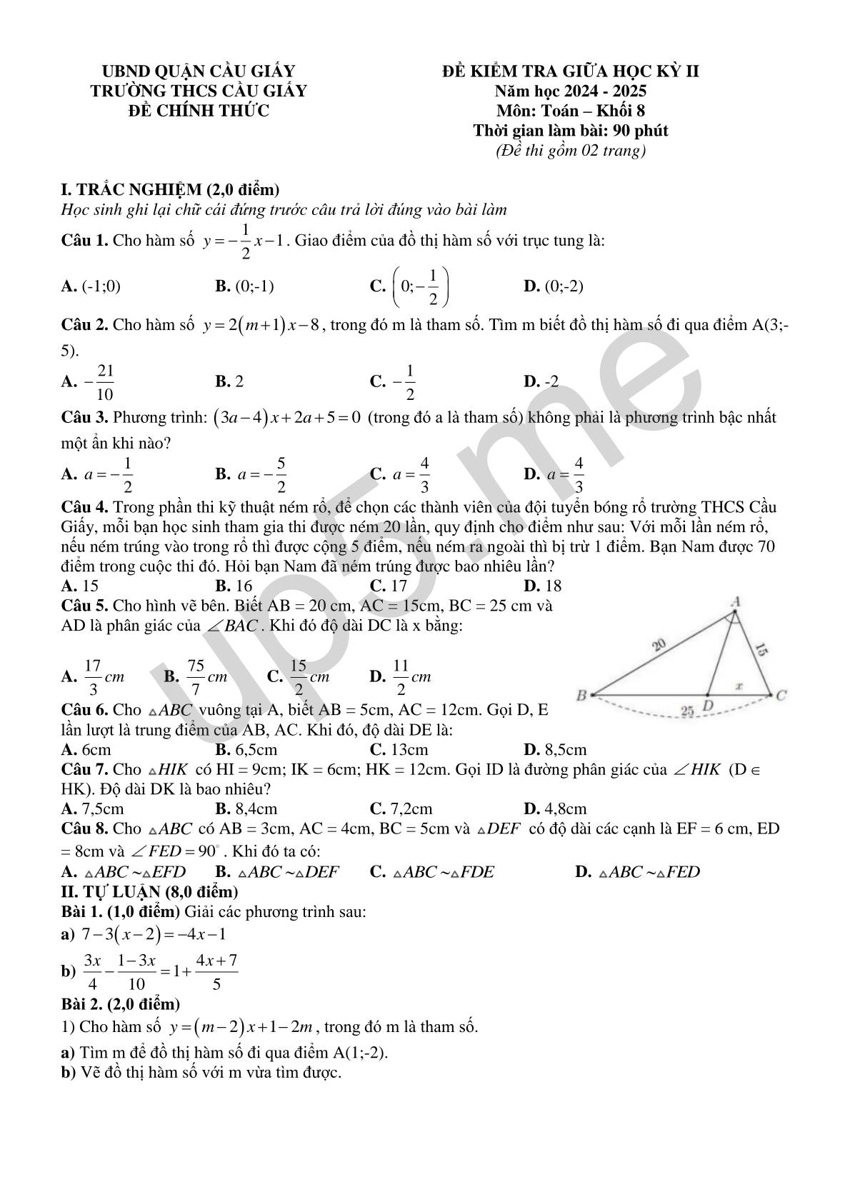 | UBND QUẬN CẦU GIẤYTRƯỜNG THCS CẦU GIẤYĐỀ CHÍNH THỨC | ĐỀ KIỂM TRA GIỮA HỌC KỲ IINăm học 2024 - 2025Môn: Toán – Khối 8Thời gian làm bài: 90 phút(Đề thi gồm 02 trang) |