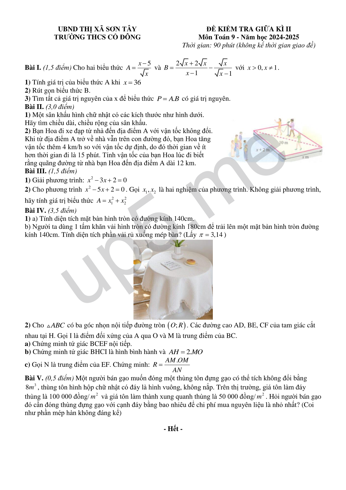 ĐỀ KIỂM TRA GIỮA KÌ IIMôn Toán 9 - Năm học 2024-2025Thời gian: 90 phút (không kể thời gian giao đề) |