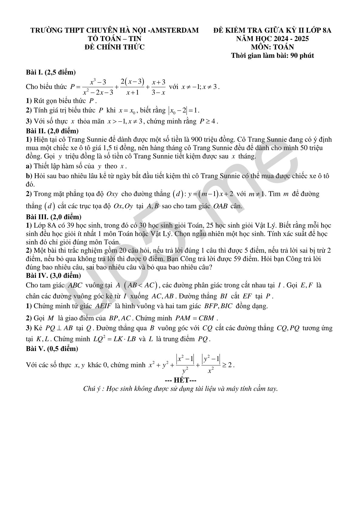 | TRƯỜNG THPT CHUYÊN HÀ NỘI -AMSTERDAMTỔ TOÁN – TINĐỀ CHÍNH THỨC | ĐỀ KIỂM TRA GIỮA KỲ II LỚP 8ANĂM HỌC 2024 - 2025MÔN: TOÁNThời gian làm bài: 90 phút |