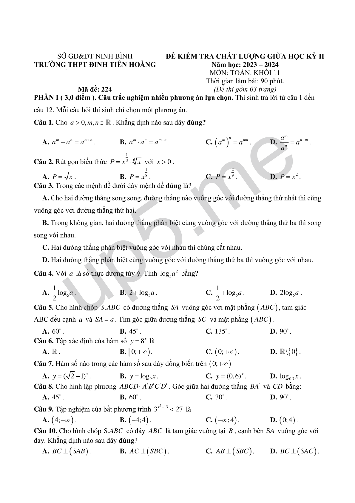 SỞ GD&ĐT NINH BÌNH TRƯỜNG THPT ĐINH TIÊN HOÀNG Mã đề: 224 |