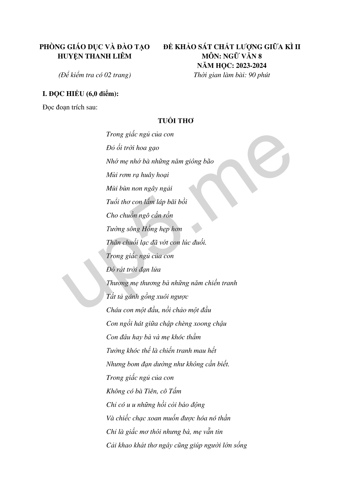 | PHÒNG GIÁO DỤC VÀ ĐÀO TẠOHUYỆN THANH LIÊM(Để kiểm tra có 02 trang) | ĐỀ KHẢO SÁT CHẤT LƯỢNG GIỮA KÌ IIMÔN: NGỮ VĂN 8NĂM HỌC: 2023-2024Thời gian làm bài: 90 phút |