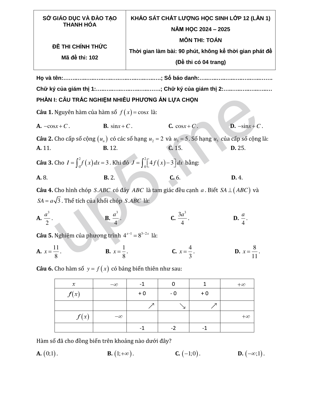 SỞ GIÁO DỤC VÀ ĐÀO TẠO THANH HÓA ĐỀ THI CHÍNH THỨCMã đề thi: 102 |