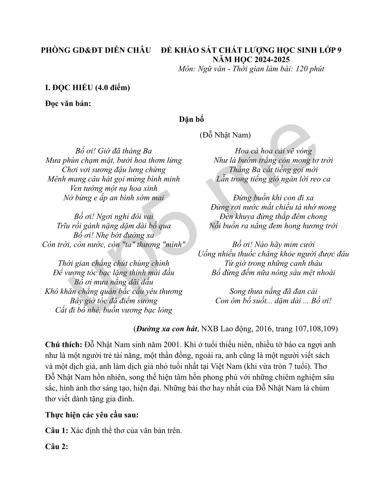Đề khảo sát chất lượng học sinh lớp 9 môn Ngữ Văn Phòng GD&ĐT Diễn Châu năm học 2024-2025