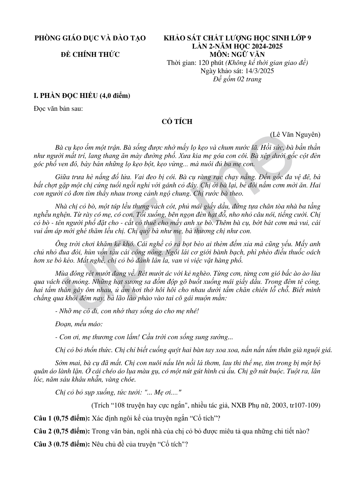 KHẢO SÁT CHẤT LƯỢNG HỌC SINH LỚP 9LẦN 2-NĂM HỌC 2024-2025MÔN: NGỮ VĂNThời gian: 120 phút (Không kể thời gian giao đề)Ngày khảo sát: 14/3/2025Đề gồm 02 trang |