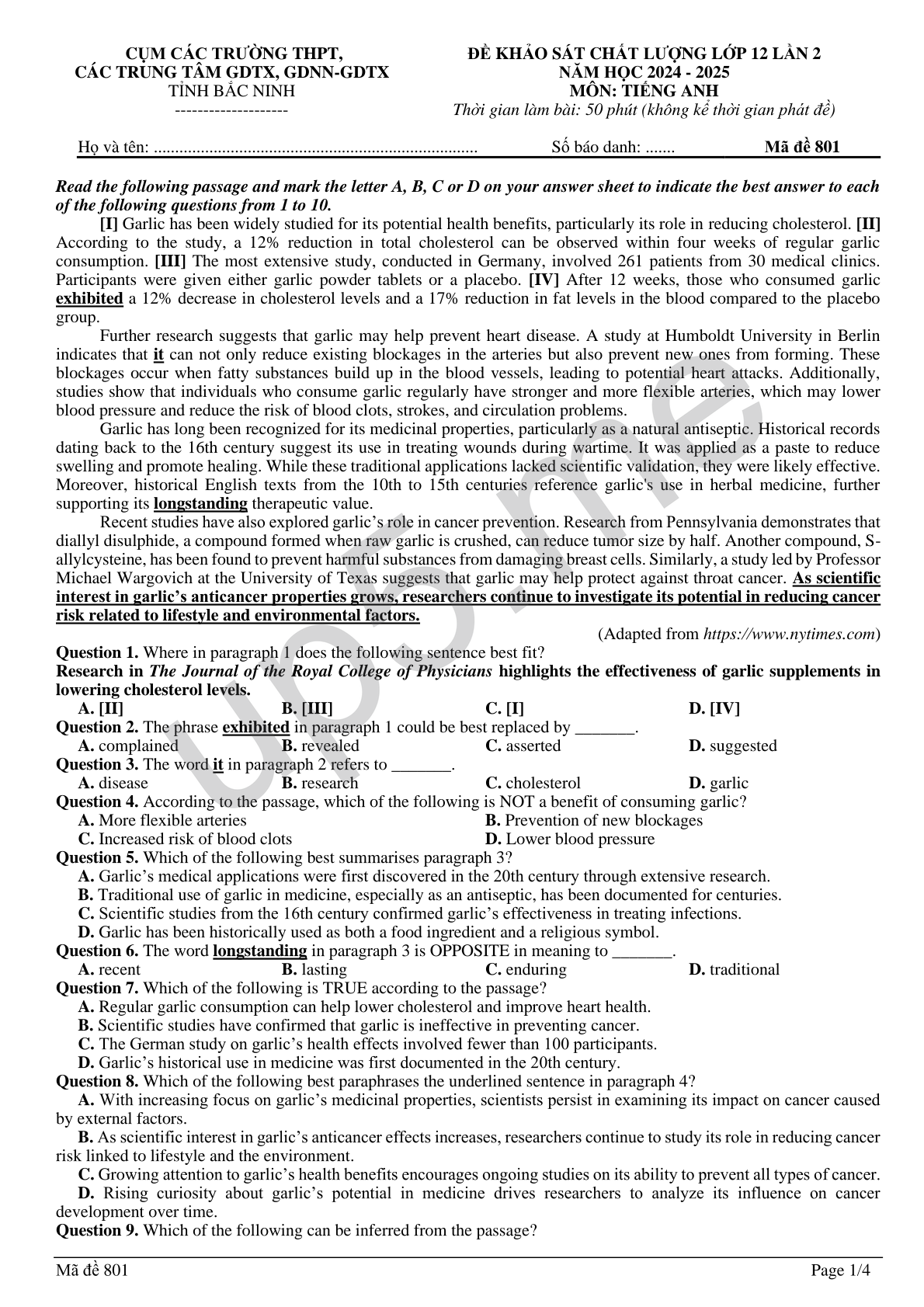 | Họ và tên: ............................................................................ | Số báo danh: ....... | Mã đề 801 |