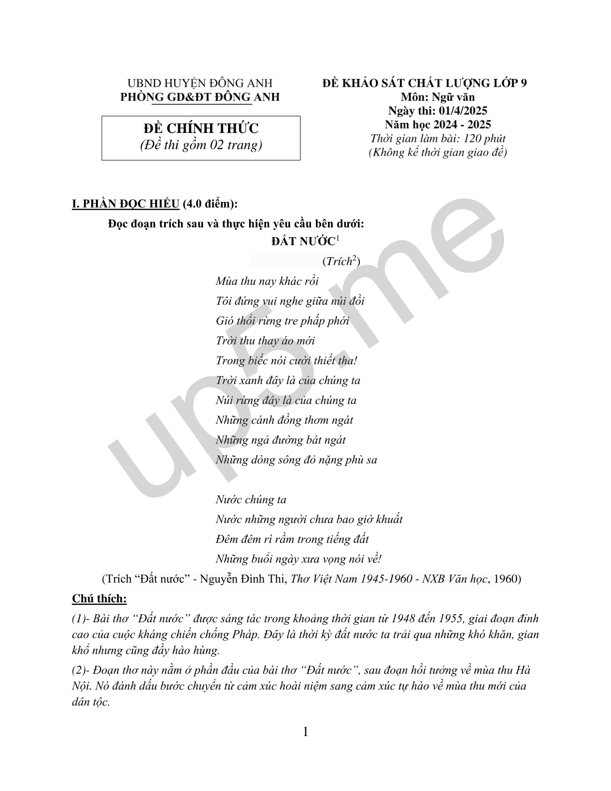 | UBND HUYỆN ĐÔNG ANHPHÒNG GD&ĐT ĐÔNG ANHĐỀ CHÍNH THỨC(Đề thi gồm 02 trang) | ĐỀ KHẢO SÁT CHẤT LƯỢNG LỚP 9Môn: Ngữ vănNgày thi: 01/4/2025Năm học 2024 - 2025Thời gian làm bài: 120 phút(Không kể thời gian giao đề) |