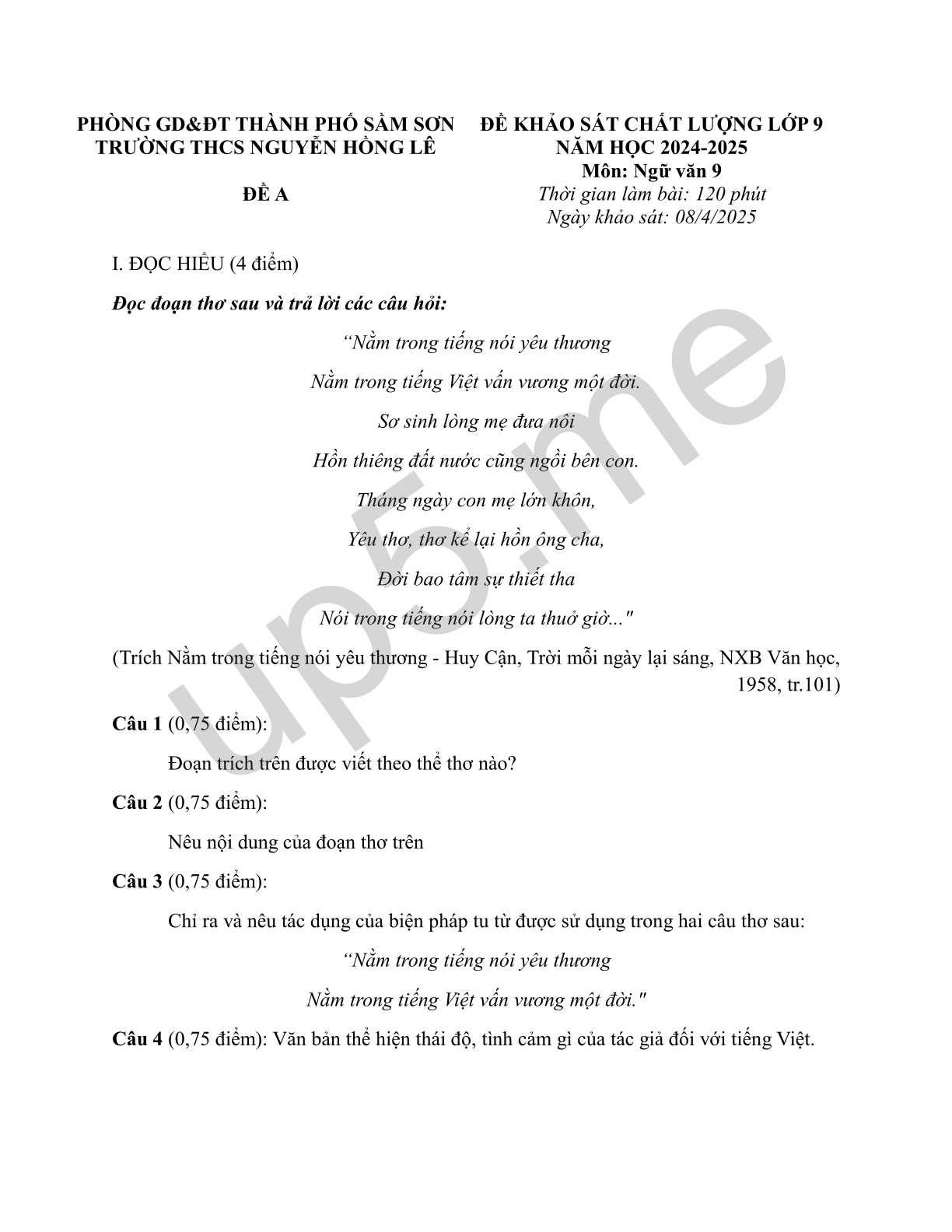 | PHÒNG GD&ĐT THÀNH PHỐ SẦM SƠNTRƯỜNG THCS NGUYỄN HỒNG LÊĐỀ A | ĐỀ KHẢO SÁT CHẤT LƯỢNG LỚP 9NĂM HỌC 2024-2025Môn: Ngữ văn 9Thời gian làm bài: 120 phútNgày khảo sát: 08/4/2025 |