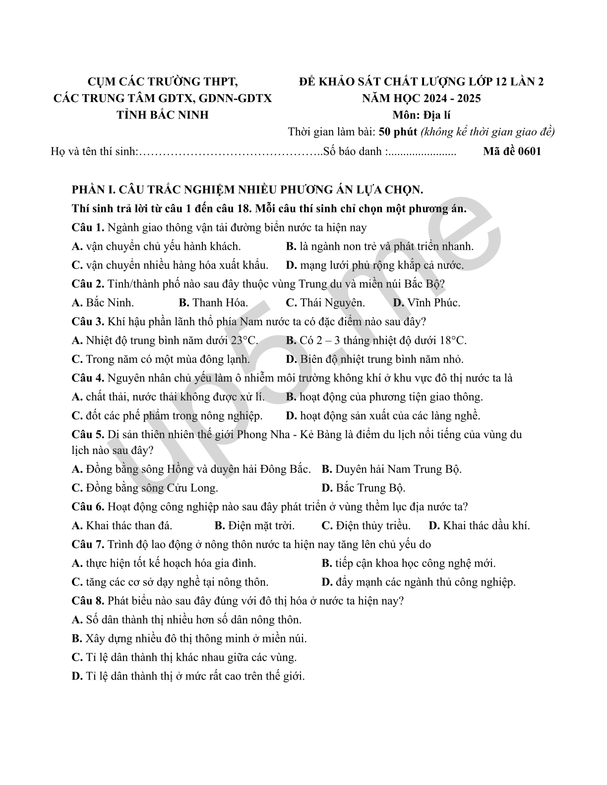 | CỤM CÁC TRƯỜNG THPT, CÁC TRUNG TÂM GDTX, GDNN-GDTX TỈNH BẮC NINH | ĐỂ KHẢO SÁT CHẤT LƯỢNG LỚP 12 LẦN 2 NĂM HỌC 2024 - 2025 Môn: Địa lí Thời gian làm bài: 50 phút (không kể thời gian giao đề) | |