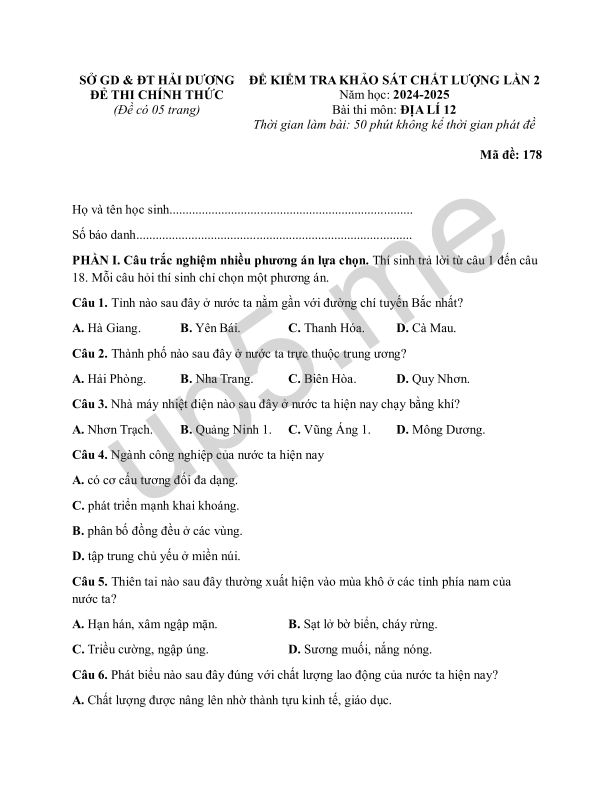 | SỞ GD & ĐT HẢI DƯƠNGĐẺ THI CHÍNH THỨC(Đề có 05 trang) | ĐỂ KIỂM TRA KHẢO SÁT CHẤT LƯỢNG LẦN 2Năm học: 2024-2025Bài thi môn: ĐỊA LÍ 12Thời gian làm bài: 50 phút không kể thời gian phát đềMã đề: 178 |