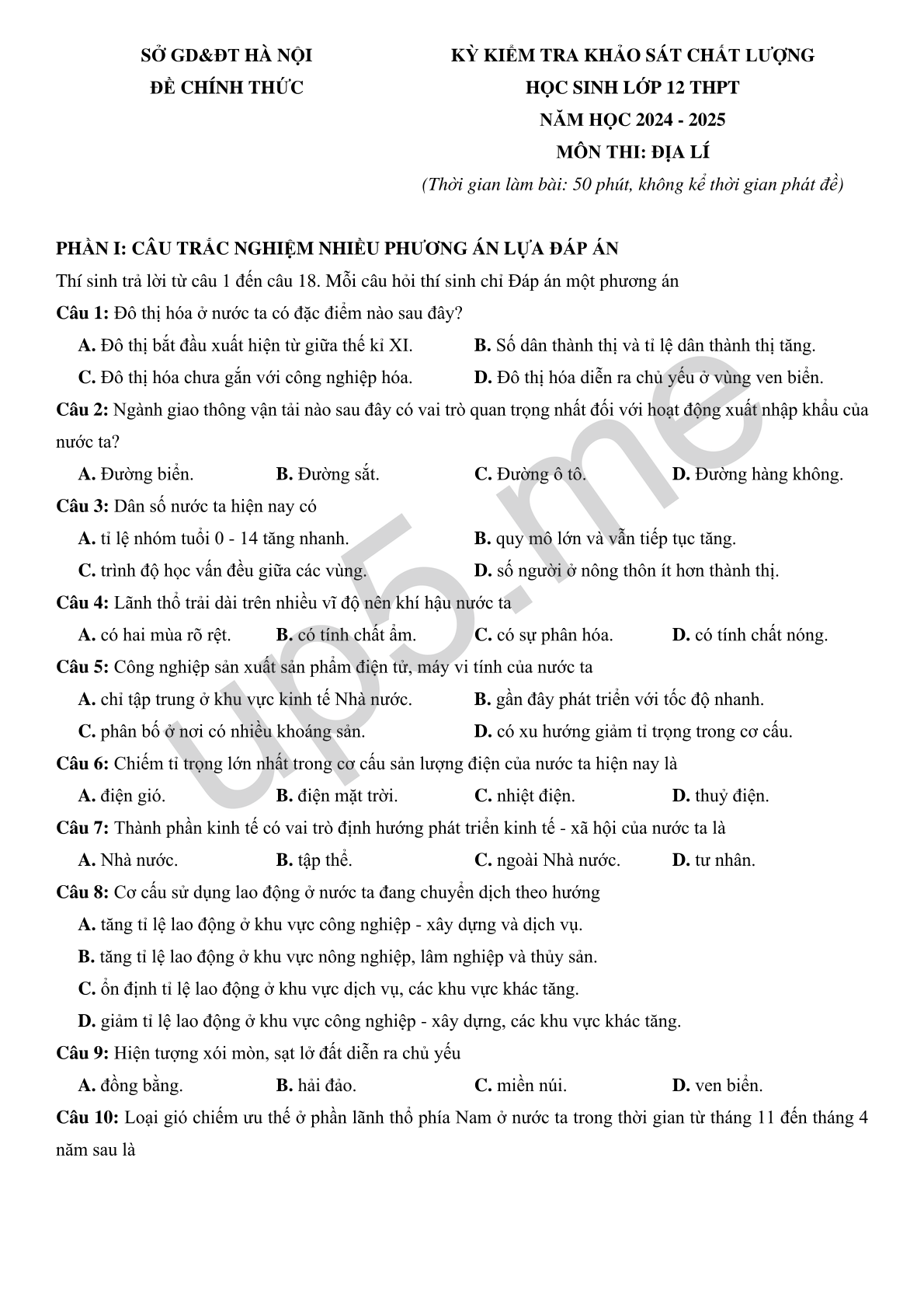 KỲ KIỂM TRA KHẢO SÁT CHẤT LƯỢNGHỌC SINH LỚP 12 THPTNĂM HỌC 2024 - 2025MÔN THI: ĐỊA LÍ(Thời gian làm bài: 50 phút, không kể thời gian phát đề) |