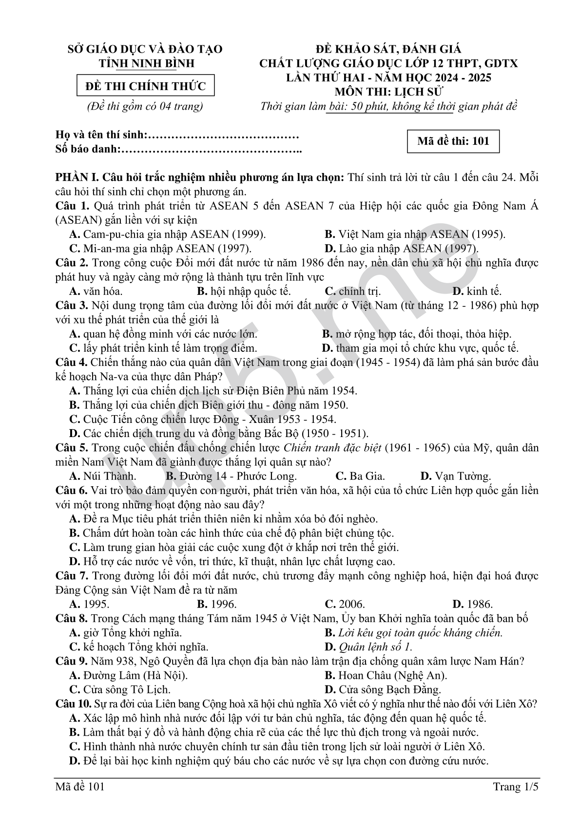 SỞ GIÁO DỤC VÀ ĐÀO TẠO TỈNH NINH BÌNHĐỀ THI CHÍNH THỨC(Đề thi gồm có 04 trang) Mã đề thi: 101 |