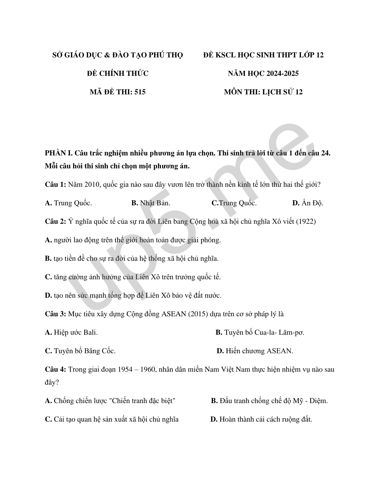 SỞ GIÁO DỤC & ĐÀO TẠO PHÚ THỌĐỀ CHÍNH THỨCMÃ ĐỀ THI: 515 |