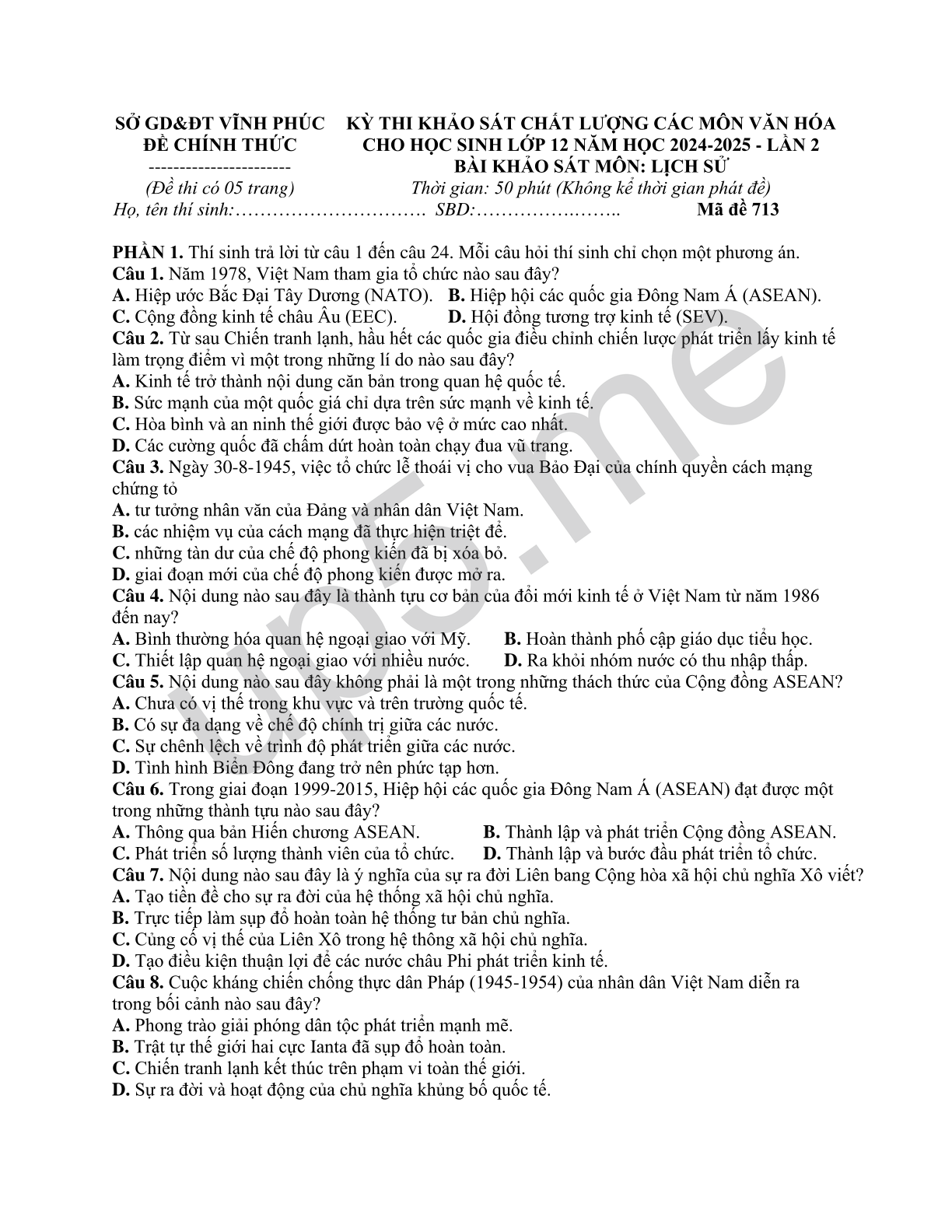 | SỞ GD&ĐT VĨNH PHÚCĐỀ CHÍNH THỨC-----------------------(Đề thi có 05 trang) | KỲ THI KHẢO SÁT CHẤT LƯỢNG CÁC MÔN VĂN HÓACHO HỌC SINH LỚP 12 NĂM HỌC 2024-2025 - LẦN 2BÀI KHẢO SÁT MÔN: LỊCH SỬThời gian: 50 phút (Không kể thời gian phát đề) | |