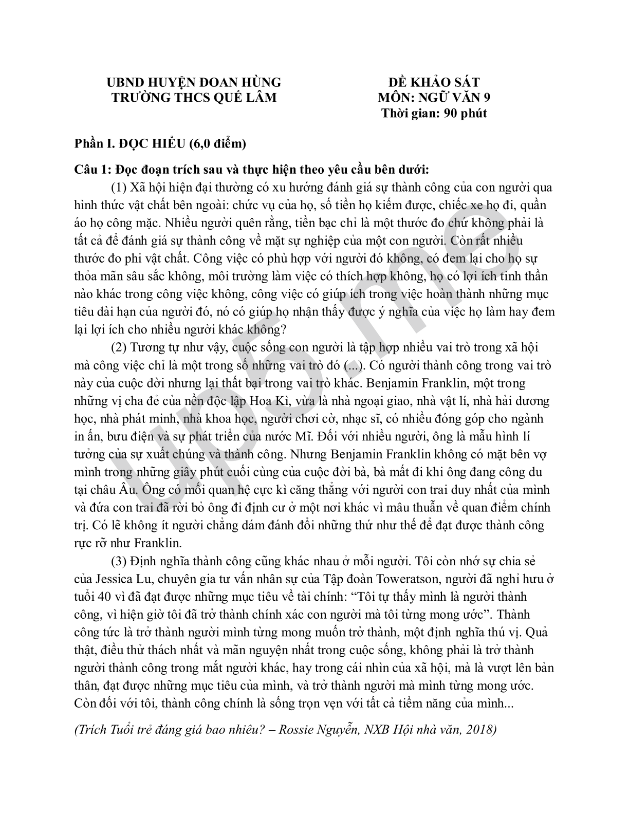 Đề khảo sát chất lượng môn Ngữ Văn lớp 9 Năm học 2024-2025, Trường THCS Quế Lâm- Huyện Đoan Hùng