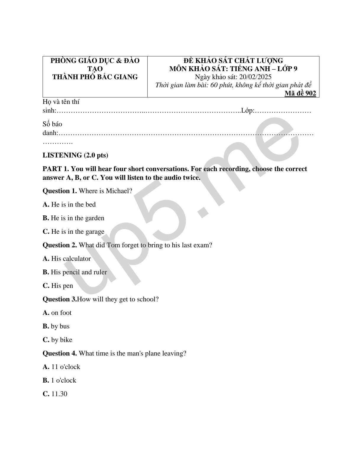 ĐỀ KHẢO SÁT CHẤT LƯỢNG MÔN KHẢO SÁT: TIẾNG ANH – LỚP 9 Mã đề 902 |