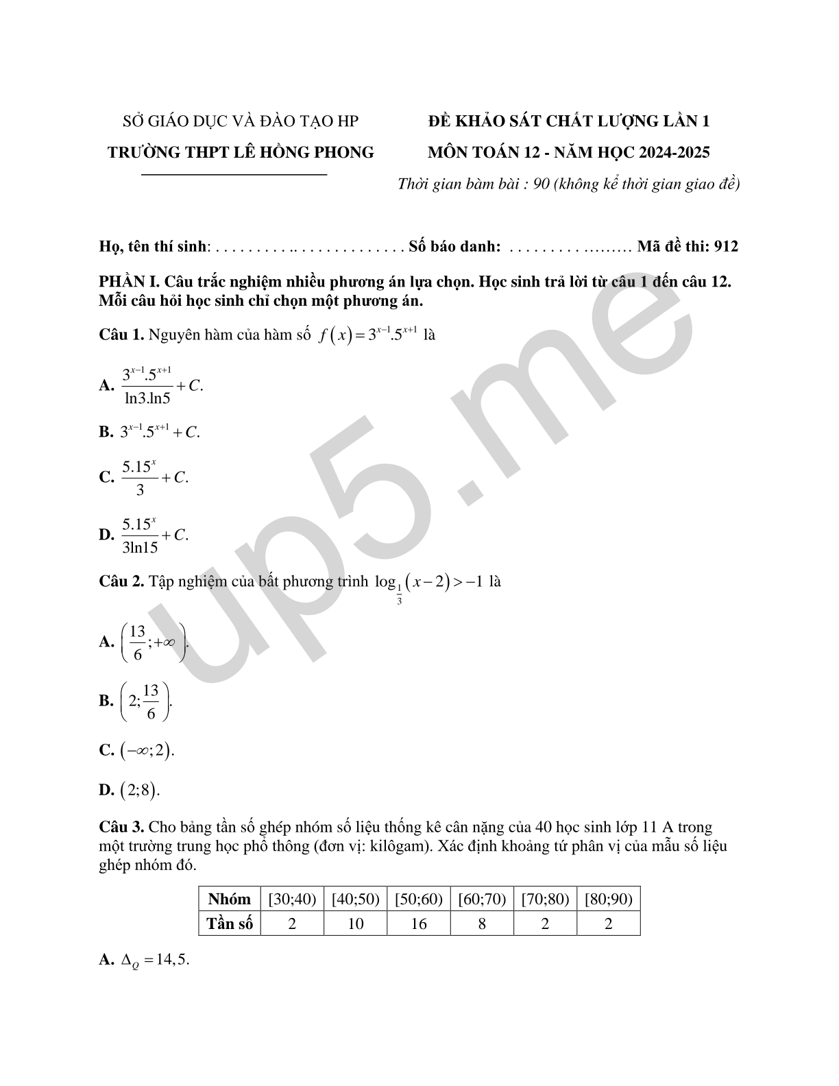 | SỞ GIÁO DỤC VÀ ĐÀO TẠO HPTRƯỜNG THPT LÊ HỒNG PHONG | ĐỀ KHẢO SÁT CHẤT LƯỢNG LẦN 1MÔN TOÁN 12 - NĂM HỌC 2024-2025Thời gian bàm bài : 90 (không kể thời gian giao đề) |