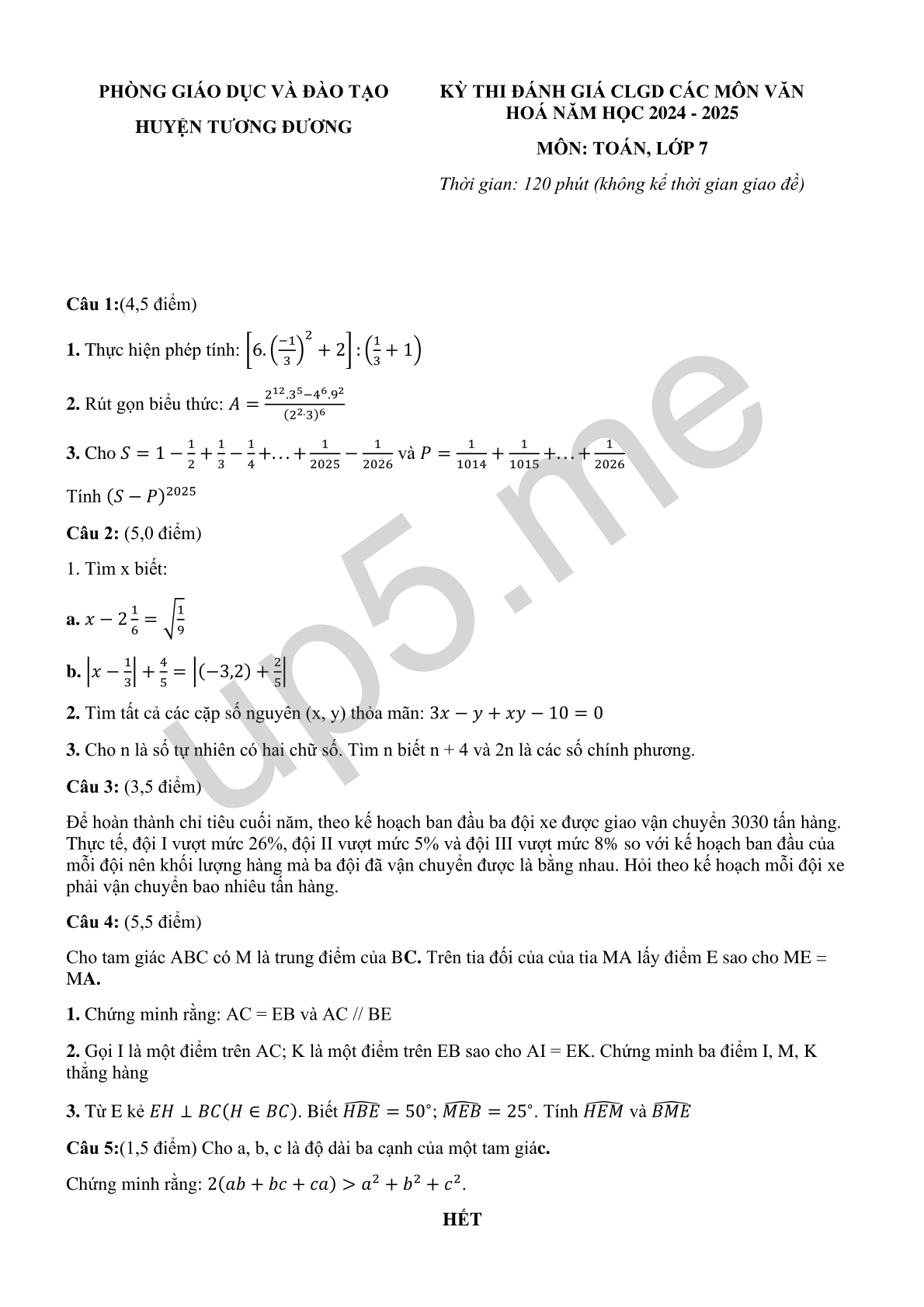 | PHÒNG GIÁO DỤC VÀ ĐÀO TẠOHUYỆN TƯƠNG ĐƯƠNG | KỲ THI ĐÁNH GIÁ CLGD CÁC MÔN VĂN HOÁ NĂM HỌC 2024 - 2025MÔN: TOÁN, LỚP 7Thời gian: 120 phút (không kể thời gian giao đề) |