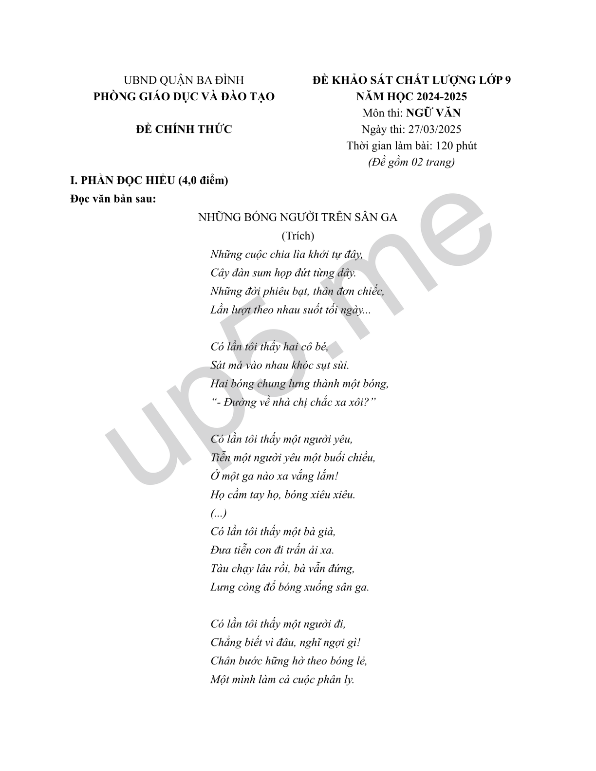| UBND QUẬN BA ĐÌNHPHÒNG GIÁO DỤC VÀ ĐÀO TẠOĐỀ CHÍNH THỨC | ĐỀ KHẢO SÁT CHẤT LƯỢNG LỚP 9NĂM HỌC 2024-2025Môn thi: NGỮ VĂNNgày thi: 27/03/2025Thời gian làm bài: 120 phút(Đề gồm 02 trang) |