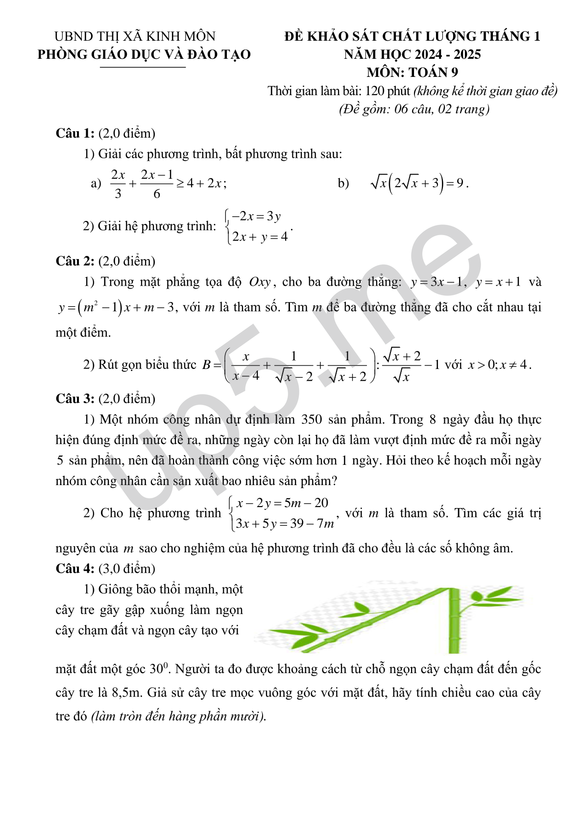 | UBND THỊ XÃ KINH MÔNPHÒNG GIÁO DỤC VÀ ĐÀO TẠO | ĐỀ KHẢO SÁT CHẤT LƯỢNG THÁNG 1 NĂM HỌC 2024 - 2025MÔN: TOÁN 9Thời gian làm bài: 120 phút (không kể thời gian giao đề) (Đề gồm: 06 câu, 02 trang) |