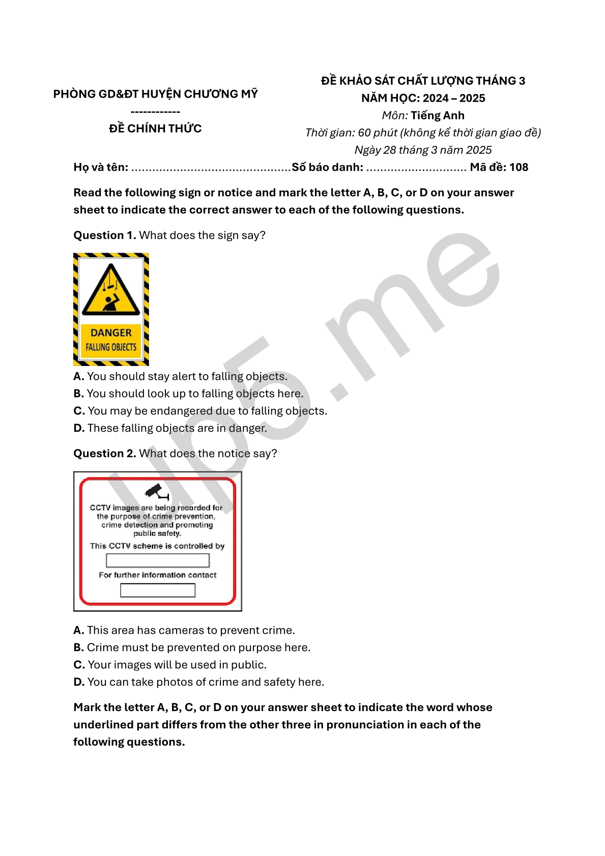 ĐỀ KHẢO SÁT CHẤT LƯỢNG THÁNG 3 NĂM HỌC: 2024 – 2025 Môn: Tiếng Anh Thời gian: 60 phút (không kể thời gian giao đề) Ngày 28 tháng 3 năm 2025 |