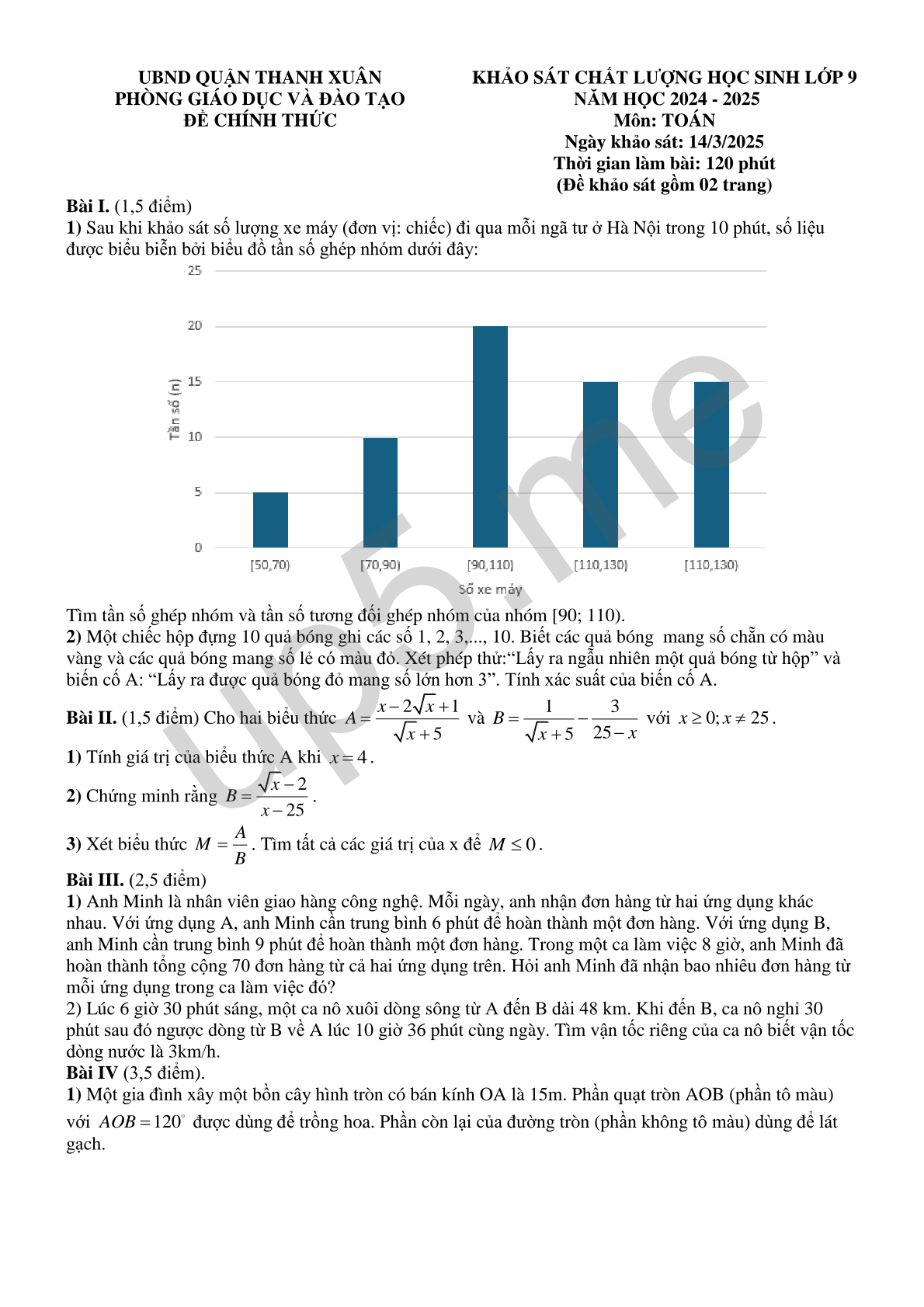 | UBND QUẬN THANH XUÂNPHÒNG GIÁO DỤC VÀ ĐÀO TẠOĐỀ CHÍNH THỨC | KHẢO SÁT CHẤT LƯỢNG HỌC SINH LỚP 9 NĂM HỌC 2024 - 2025 Môn: TOÁN Ngày khảo sát: 14/3/2025 Thời gian làm bài: 120 phút (Đề khảo sát gồm 02 trang) |