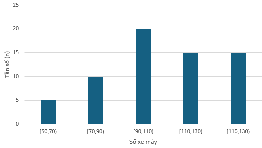 1) Sau khi khảo sát số lượng xe máy (đơn vị: chiếc) đi qua mỗi ngã tư ở Hà Nội trong 10 phút, số liệu được biểu biễn bởi biểu đồ tần số ghép nhóm dưới đây: